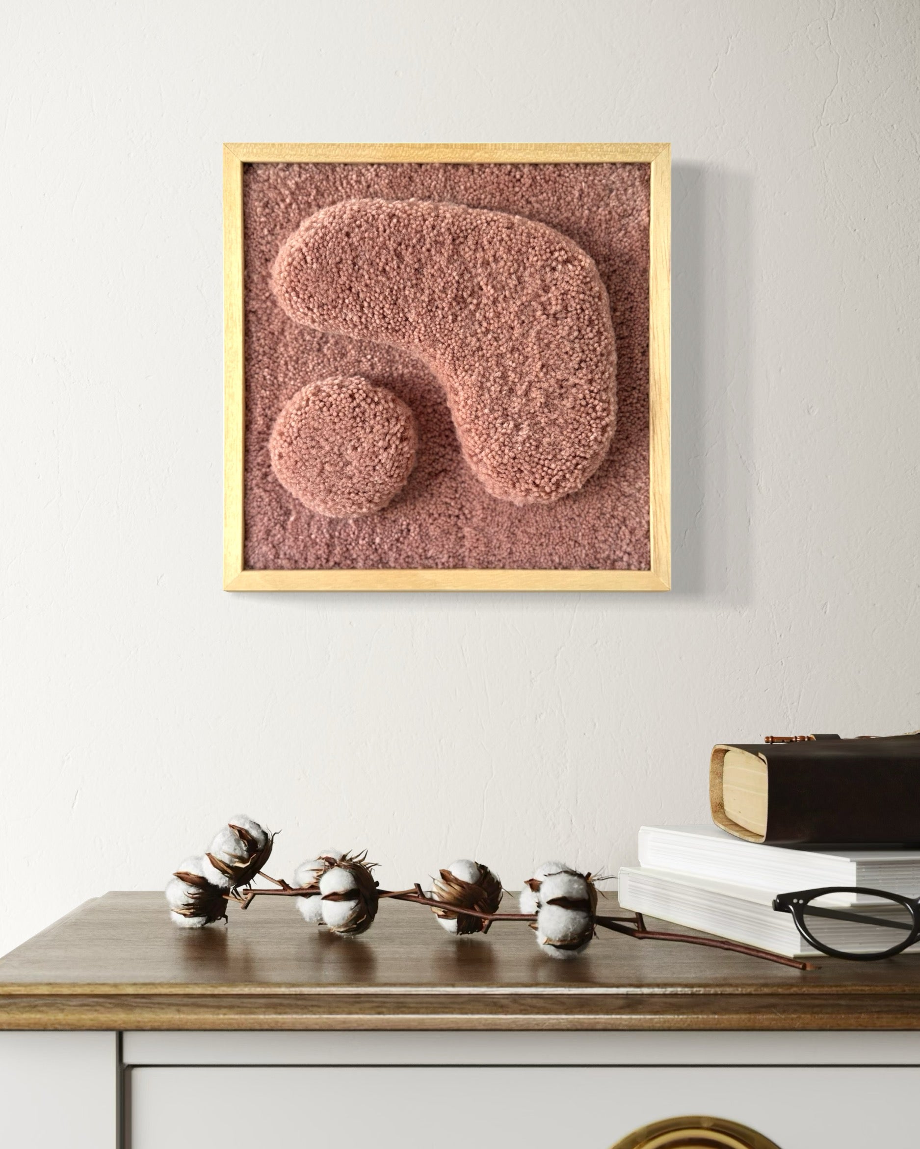 This desert rose fiber piece adds texture, depth, and softness to any wall. Its abstract, organic shapes spark curiosity and make it a conversation starter.